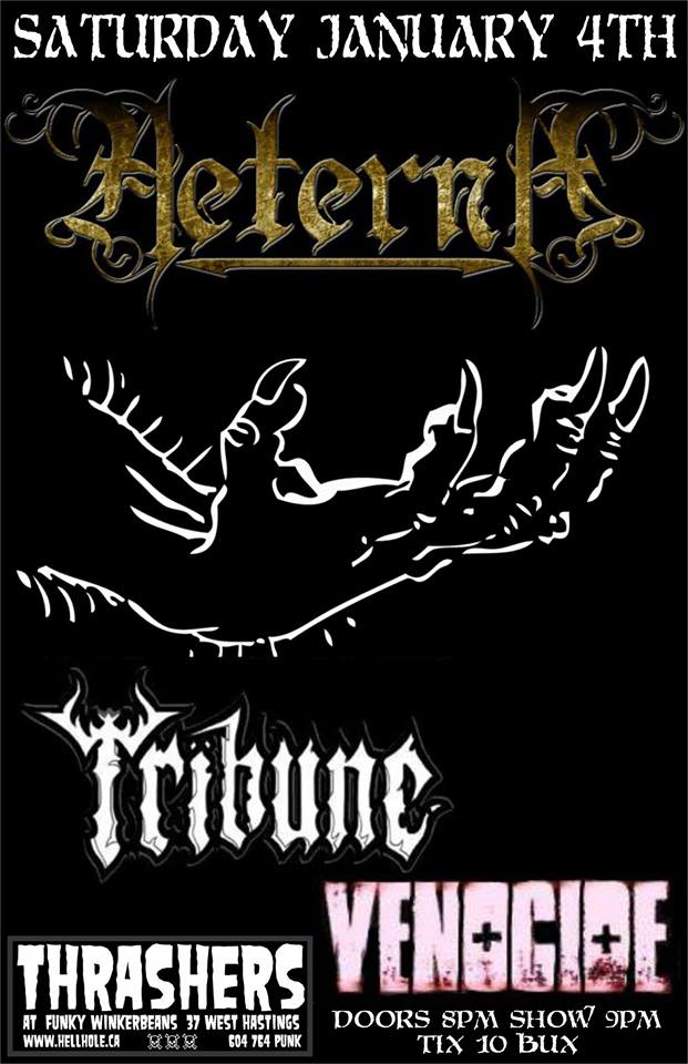 first aeterna show in vancouver since april 2013. come see tribune kill and venocide destroy. between that and brutal power metal, ain't gonna be nothing left of the old bean. shake off those new years hangovers and support great metal, you pussies.