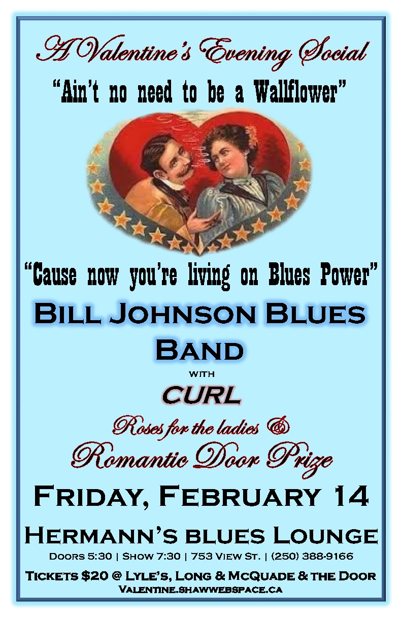 You are cordially invited to a VALENTINE'S EVENING SOCIAL at Hermann's Jazz and Blues Lounge, featuring entertainment by the BILL JOHNSON BLUES BAND with opening act, CURL: The Bill Johnson Blues Band, CURL