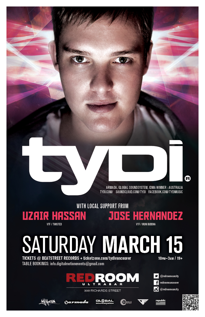 IDMA award winning international DJ, producer & songwriter: TYDI  (with local suport from), UZAIR HASSAN, JOSE HERNANDEZ @ The Red Room Mar 15 2014 - Dec 23rd @ The Red Room