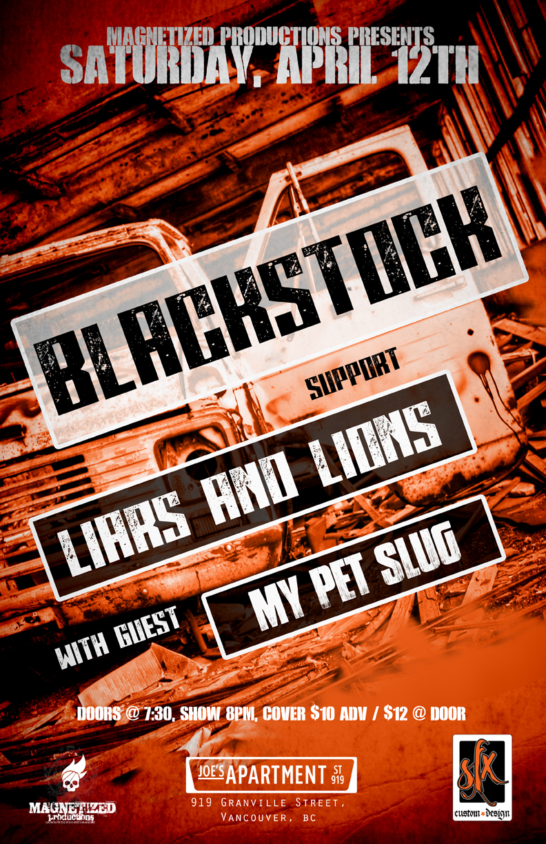 Magnetized Productions Proudly Presents: Blackstock , Liars And Lions with Guest My Pet Slug". Saturday, April 12th @ Joe's Apartment, 919 Granville Street, Vancouver. Doors @ 7:30, Show 8pm, Cover $10 Adv / $12 @ Door