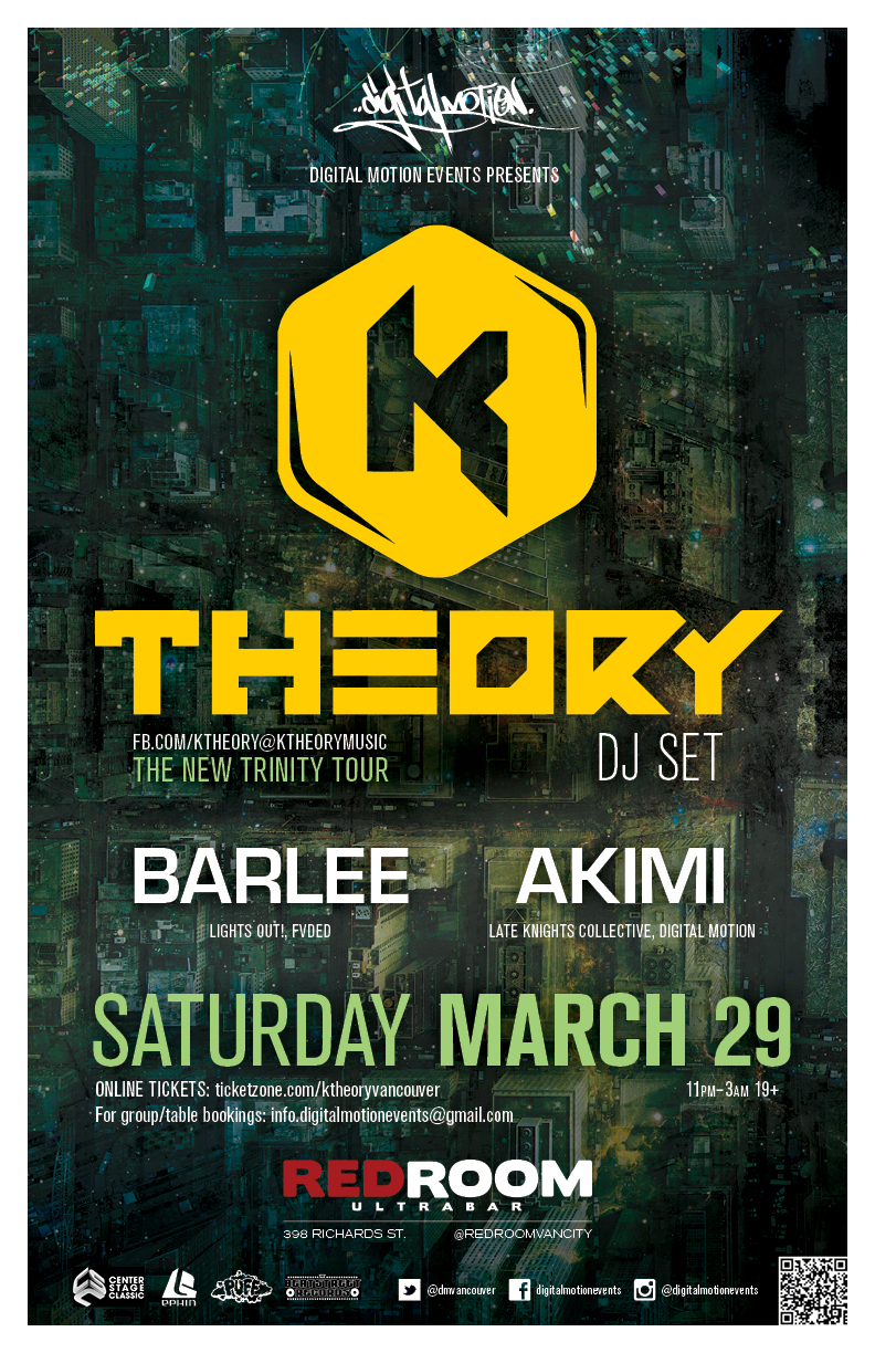 K Theory is the trio of Malcolm Anthony (vocals), Dylan Lewman (sampling, live conducting), and Dustin Musser (Keys, sampling). This San Francisco based group has made serious waves and played shows all over the continent. With chart topping singles and major label released remixes, they are heavily respected amongst the intelligent bass and hip hop scenes.