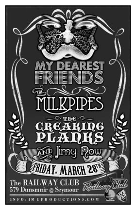 . Friday, March 28th IMU presents MY DEAREST FRIENDS, The MILK PIPES, The CREAKING PLANKS & JIMY NOW @ The Railway Club, 579 Dunsmuir . Show 9:30pm sharp! Cover $10 . Purchase advance tickets online @ http://www.imuproductions.com/tix
