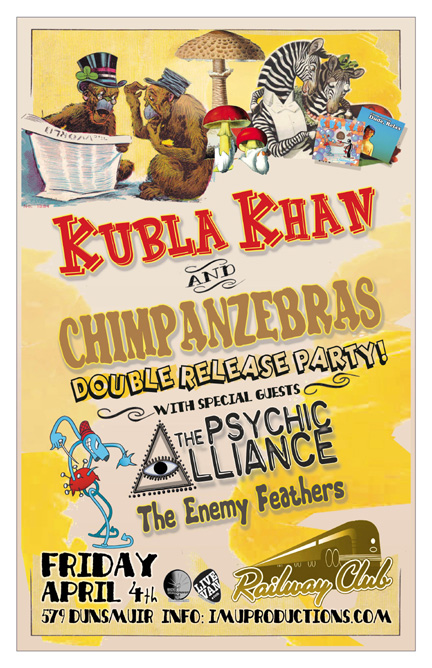 . Friday, April 4th IMU presents KUBLA KHAN & CHIMPANZEBRAS Double Release Party w/ PSYCHIC ALLIANCE & The ENEMY FEATHERS @ The Railway Club, 579 Dunsmuir . Show start 9:30pm sharp! Purchase advance tickets online @ http://www.imuproductions.com/tix