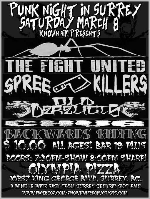 PUNK NIGHT IN SURREY!  ALL AGES & BAR: THE FIGHT UNITED, Spree Killers , Old Derelicts, Chug, Backwards Riding  @ Olympia Pizza, Surrey Mar 8 2014 - Feb 6th @ Olympia Pizza, Surrey