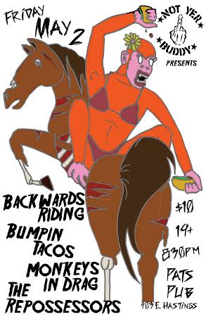 heavy hitting psych rockers Backwards Riding with them twisted trainwreck rockers Monkeys in Drag, 2pc garage rockers The Repossessors and the seductively sexy Tickling Grandma are throwing down at Pat's Pub ... this will certainly be some kind of wonderful folks!!