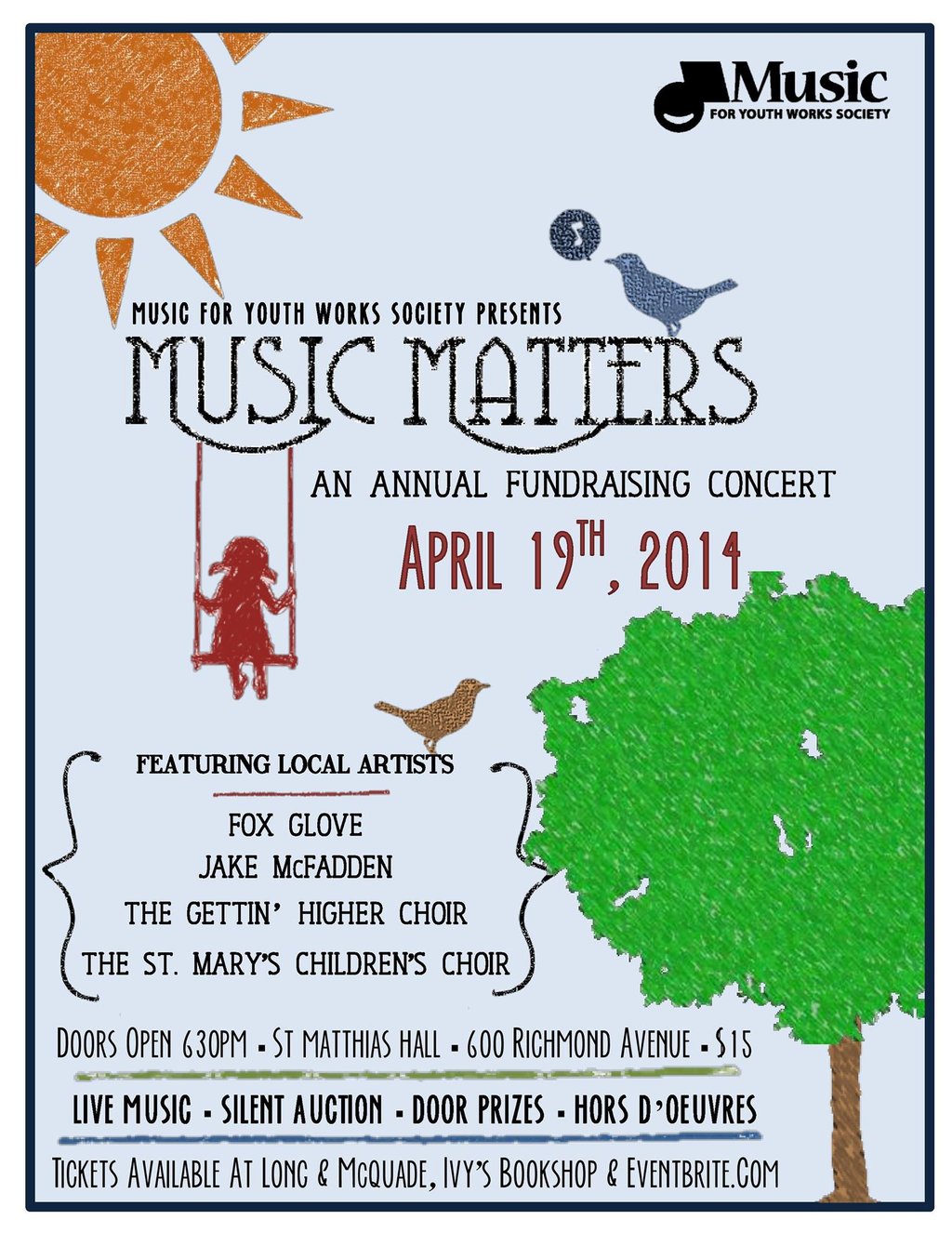 Featuring performances by local musicians; silent auction; hors d'oeuvres & refreshments; and door prizes! Performers include Fox Glove, Jake McFadden, The Gettin' Higher Choir, and The St. Mary's Childrens Choir.