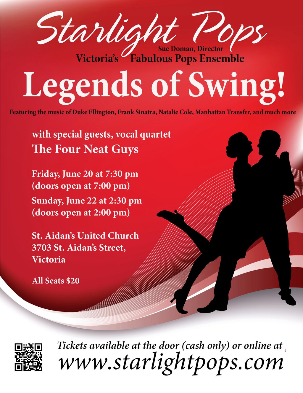 Get ready to swing with Starlight Pops, Victoria's fabulous 75-voice ensemble directed by Sue Doman, as they present their end-of-season concert, "Legends of Swing!" featuring famous hits from George and Ira Gershwin, Irving Berlin, Duke Ellington, Natalie Cole, Manhattan Transfer, Frank Sinatra, and many others. Starlight Pops is uniquely supported by a four-piece combo of outstanding local musicians led by pianist Peter Rothhauser. Special guests for this concert are The Four Neat Guys, a well-known Victoria-based male vocal quartet. Two performances at St. Aidan's: Friday June 20 at 7:30 pm and Sunday June 22 at 2:30 pm. Tickets ($20) available from choir members, at the door (cash only) or online at www.starlightpops.com.