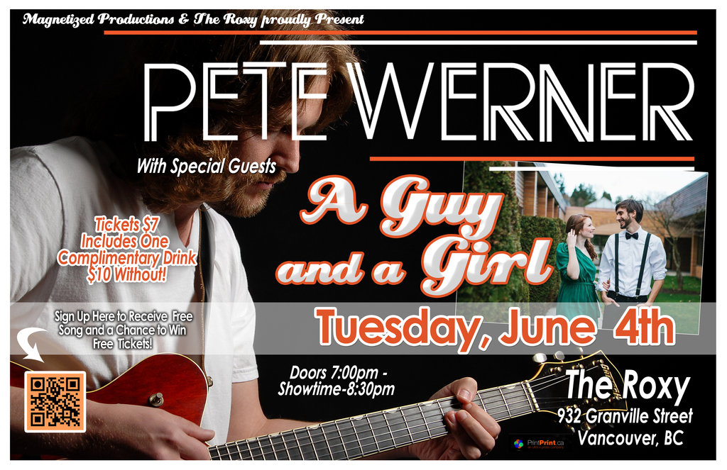 Magnetized Production Present: Tuesday, June 24th - Pete Werner with Guest A Guy And A Girl @ The Roxy, 932 Granville Street, Vancouver. Doors @ 7 pm, Showtime 8:30 pm, Cover $7 with Ticket Includes One Complimentary Drink / $10 without
