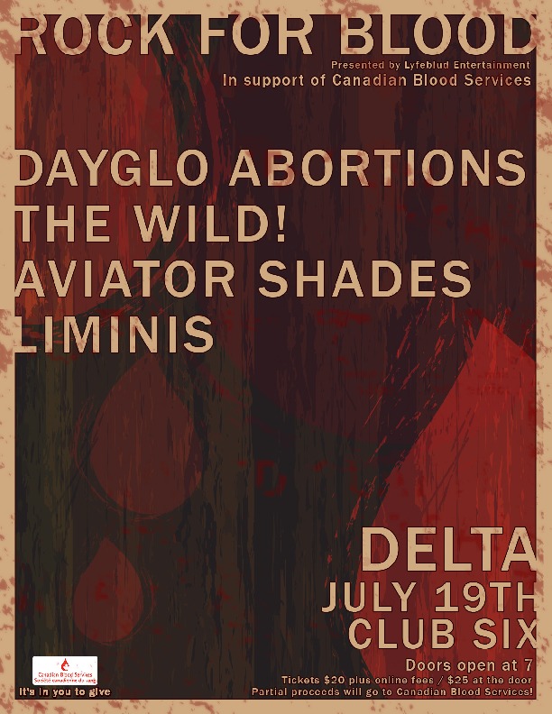 Rock For Blood: Dayglo Abortions, The Wild!, AVIATOR SHADES, Liminis @ Club 6 - 11920 70 ave Jul 19 2014 - Feb 8th @ Club 6 - 11920 70 ave