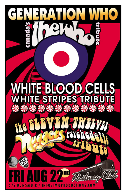 . Friday, August 22nd IMU presents GENERATION WHO Canada's Who Tribute, WHITE BLOOD CELLS White Stripes Tribute & The ELEVEN TWELVES Psychedelic Nuggets Tribute @ The Railway Club, 579 Dunsmuir . Show 10pm / $10 cover
