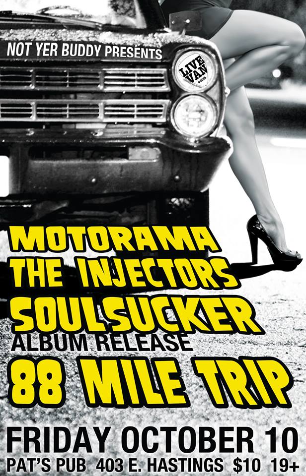 none of these bands are openers but one of em has to ... so i hope you have the good sense to show up on time. Soulsucker are finally dropping their debut CD c/o NYB and wanted to party with their bro's so joining em is the awesome psych/stoner metal machine 88 Mile Trip, those greasy grimy good time rocknrollers The INJECTORS and the resurrected, reformed, revved up punk rock ear rapists MOTORAMA ... beginning to end, this will rage!