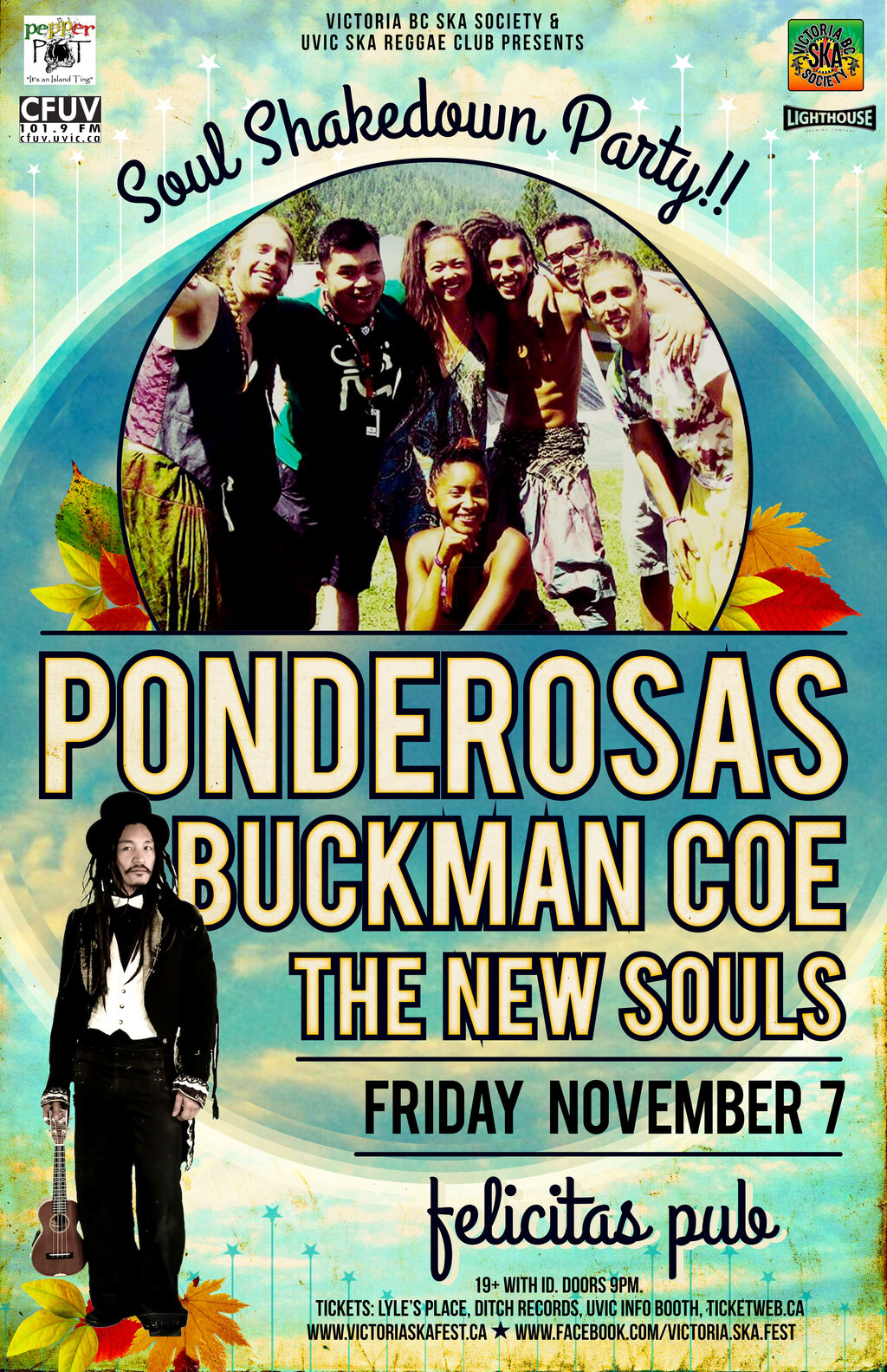 Victoria BC Ska Society and UVIC Ska/Reggae Club is proud to present Soul Shakedown 2014 featuring The Ponderosas, Buckman Coe and The New Souls. The Ponderosas will be giving us some sneak peaks from their upcoming album that will be released just before Christmas of this year. Buckman Coe also has a brand new album that is set for release in October 2014 called "Precession" The band will be playing songs off it at the show. Precession was produced by Adham Shaikh and features some heavy hitters in the Vancouver music scene including Michael Fraser, Tom Van Deursen (Boom Booms), Kristie McCracken, and Martin Reisle.