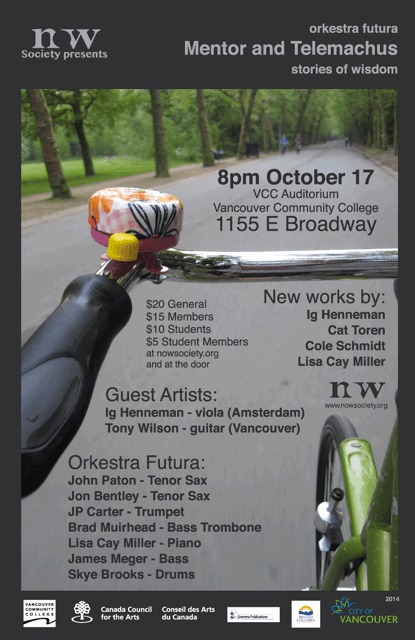 Ig Henneman, world-renowned violist and composer from Amsterdam, will compose a new work for especially for the NOW Society ensemble orkestra futura. Henneman, one of Miller's primary mentors, will travel to Vancouver to present her work, give workshops and lectures and to perform with NOW. Cole Schmidt will compose a work featuring his teacher, composer and guitarist Tony Wilson, one of Vancouver’s most valued musicians. New York-based Cat Toren piece will feature her mentor Lisa Cay Miller. Miller will also perform a work of another of her mentors, a solo piano piece by American composer Bunita Marcus. The concert will span three generations of musicians dedicated to the creation of original, groundbreaking work, and highlight the regenerative impact that the passing down and exchange of musical knowledge gives to musical communities and to the preservation of composition and especially of improvisation, essentially an oral tradition where connection with elders is essential to the maintenance of the art form.