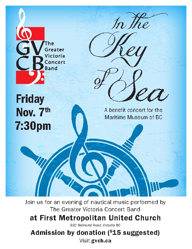 Join us for an evening of nautical music performed by the Greater Victoria Concert Band's Senior level band, benefiting the Maritime Museum of BC. Admission by donation ($15 suggested). Visit gvcb.ca