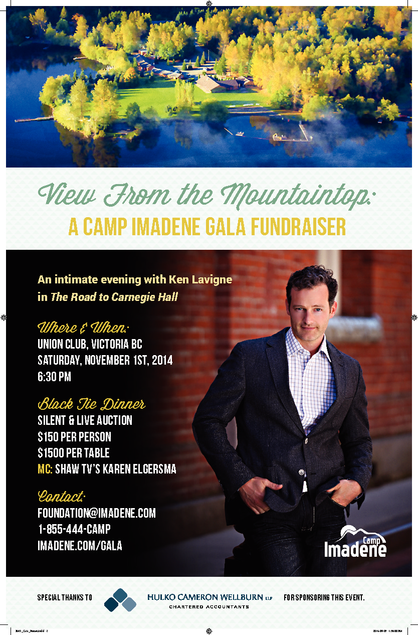 Camp Imadene Gala Fundraiser - Featuring Ken Lavigne "The Road to Carnegie Hall". November 1st, 6:30pm @ the Union Club of BC, 805 Gordon St. Victoria BC. $150 PP. Call 1-855-444-CAMP or go to www.imadene.com/gala to purchase tickets or reserve a table.