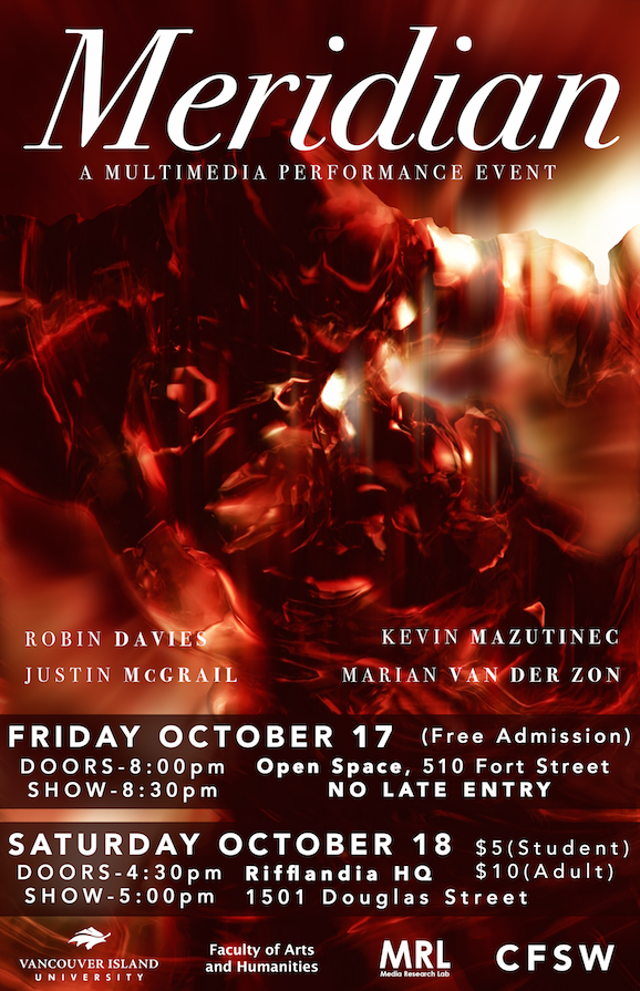 A multi-media performance featuring Robin Davies (electronic music), Kevin Mazutinec (digital video), Justin McGrail (spoken word), and Marian van der Zon (music and vocals). Meridian involves the use of digital technologies and live performance to create an event that combines projected-video, ambient-electronic music, acoustic instruments, processed and looped vocals, and spoken word poetry. The resulting blend of prepared and improvised sounds, sights, and words creates an experimental, immersive performance that explores technology, humanity, and the spaces in between the two. www.meridian.is