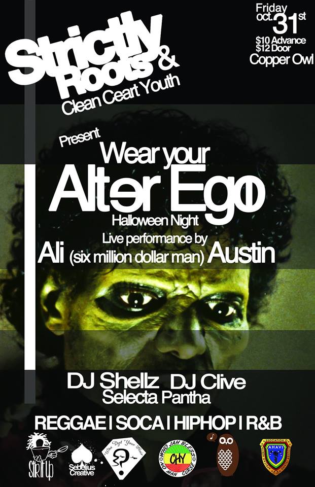 Friday October 31st ...Halloween Night WEAR YOUR ALTER EGO. Show your good or bad side. Dress up as who you want to be or think you are. Angels, Devils and everything in between will be in attendance. Keep your identity a secret until the night is through. Prizes for best costume in effect. Live Performance by Ali "six million dollar man" Austin along side DJ Clive, DJ Shellz and Selecta Pantha. $10 advance (250 590-6694 Stir it Up Caribbean,$12 @ door (Copper Owl 1900 Douglas St.).