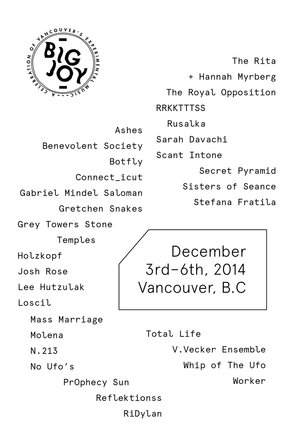 Big Joy 2014 Lineup TBA: Loscil, Sarah Davachi, Total Life, Garbiel Mindel Saloman, V. Vecker Ensemble , SECRET PYRAMID, Lee Hutzulak, Sisters Of Seance, The Rita, Holzkopf, Prophecy Sun , Josh Rose