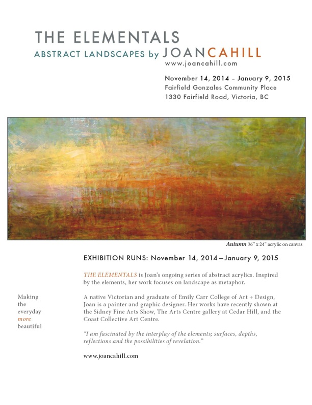 Inspired by the elements, her work focuses on landscape as metaphor. A native Victorian and graduate of Emily Carr College of Art + Design, Joan is a painter and graphic designer. Her works have recently shown at the Sidney Fine Arts Show, The Arts Centre gallery at Cedar Hill, and the Coast Collective Art Centre.
