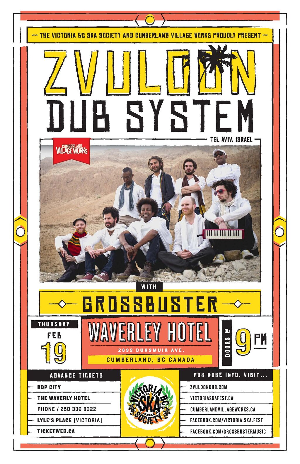 Victoria BC Ska Society & Cumberland Village Works are collaborating to present the return of Zvuloon Dub System from Tel Aviv, Israel. Zvuloon Dub System are returning to Canada after playing on the Victoria Ska Festival this past summer. Their tour then also landed them a spot on the world famous Sierra Nevada World Music Festival.