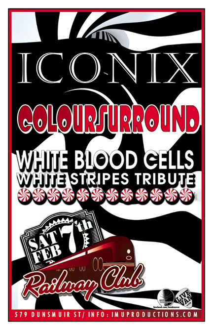 . Saturday, February 7th IMU presents ICONIX, WHITE BLOOD CELLS White Stripes Tribute, COLOURSURROUND & guests @ The Railway Club, 579 Dunsmuir . Show 9:30pm / $10 cover