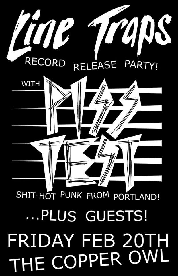 LINE TRAPS are having a party to celebrate the release of our debut LP. We're bringing up one of the best current punk bands in the Pacific Northwest, PISS TEST, to help us celebrate...and we'll be announcing local guests in the next couple days. Someone will be spinning killer records...and you can pick up a copy of our new LP!