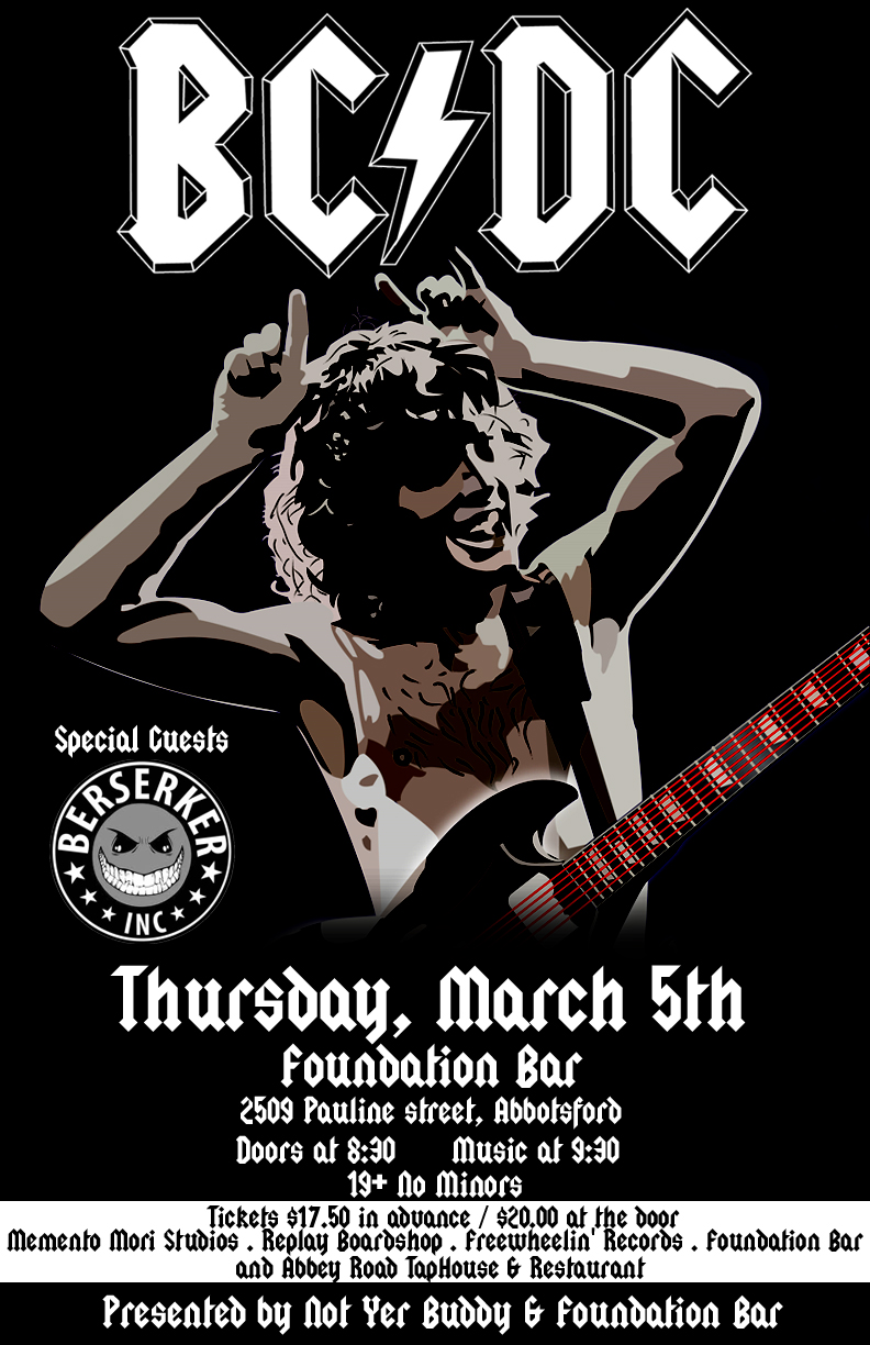 There are tribute bands, and then there's BC/DC. They were born of bush party ashes in the summer of 1999. Some 500+ unexpected gigs later, Canada's BC/DC has systematically redefined the concept of a tribute band, garnering iconic status among diehard fans, agents, and venues from Vancouver BC to Jackson Hole, Wyoming, from backyard biker bashes to the star-studded legendary rooms of Las Vegas, from Nelson to NYC and most recently Japan. While a web search will turn up dozens of AC/DC cover acts around the world, there aren't likely many who've so successfully branded the Aussie band's timeless raunch with such epic rock n' roll fury, while also managing to bottle the essence of a wild frontier lifestyle.
