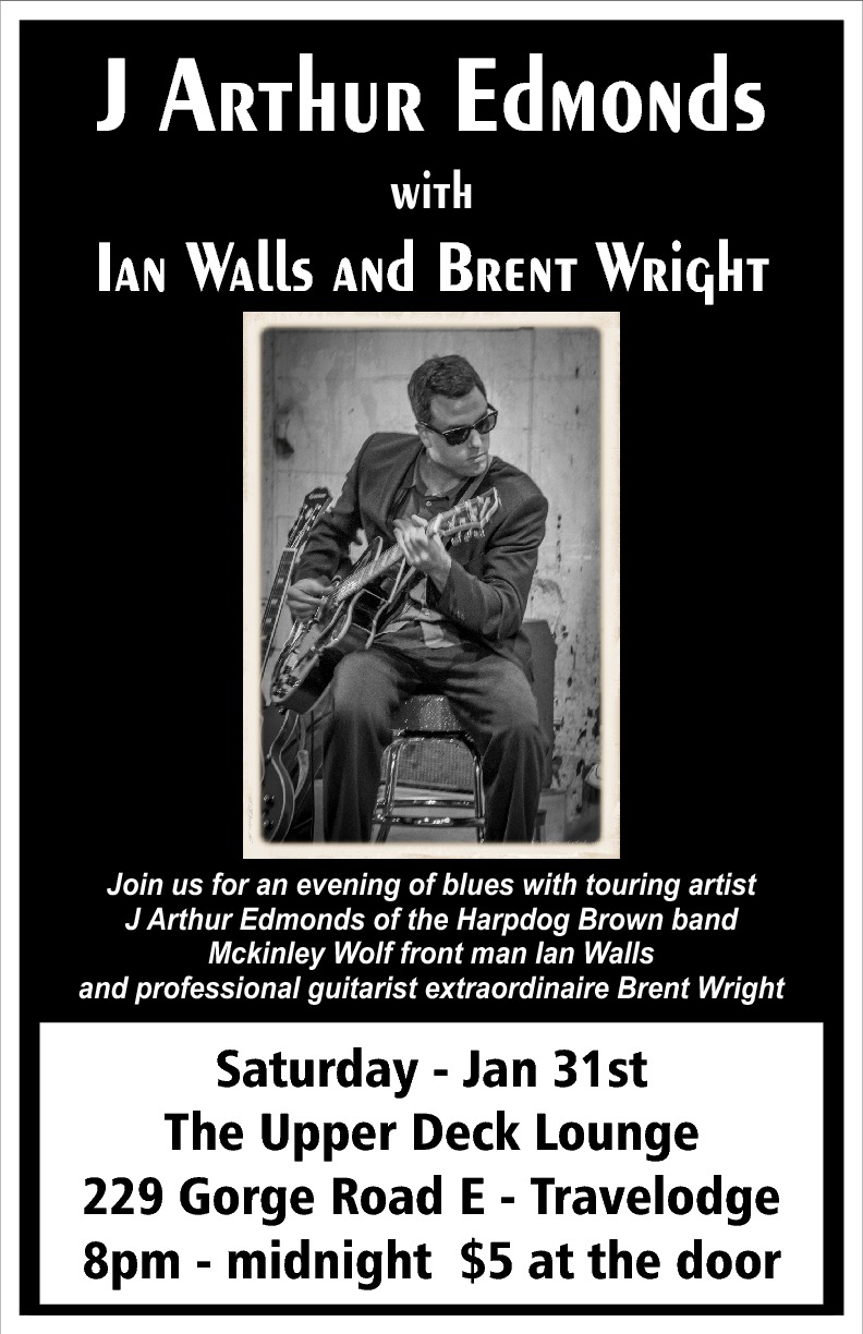 J ARTHUR EDMONDS (aka Jordie Edmonds), home between national tours with Maple Blues winner Harpdog Brown will sing and play Blues guitar for a Saturday night Blues party. Joined by IAN WALLS (bass/vocals McKiNLeY WoLf) and veteran guitarist BRENT WRIGHT (Jerry Doucette, Long John Baldry, Donald Ray Johnson) it promises to be a great night of dancing and listening to the Blues!