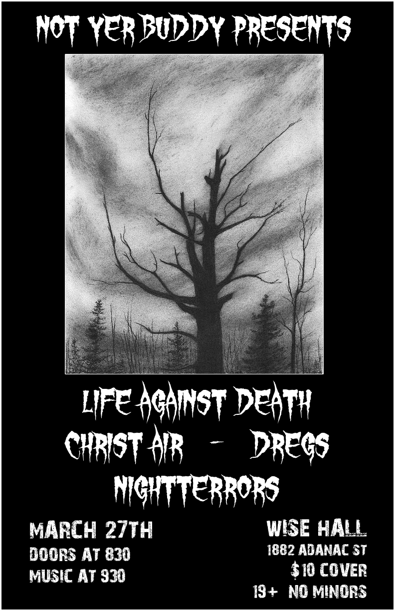 easily the heaviest show we've done to date and holy shit this line up shreds ... Life Against Death, Christ Air, Dregs & Nightterrors!!! let's crush some beers and thrash about