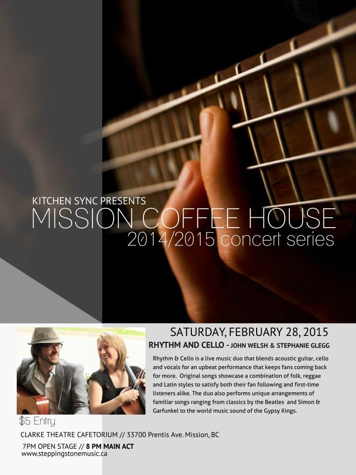 Have a cup of coffee and listen to some great local musicians at the Mission Coffee House Concert Series. Hosted by "Kitchen Sync", the Mission Coffee House 2014-2015 Season opens Saturday, October 18th and closes Saturday May 23rd, 2015. Open to musicians of all ages, we are located in the Cafetorium at Mission Heritage Park Centre/Clarke Theatre. Be sure to book your calendar! Doors open at 7pm with an open stage with the Main acts at 7:30pm. Admission is $5.