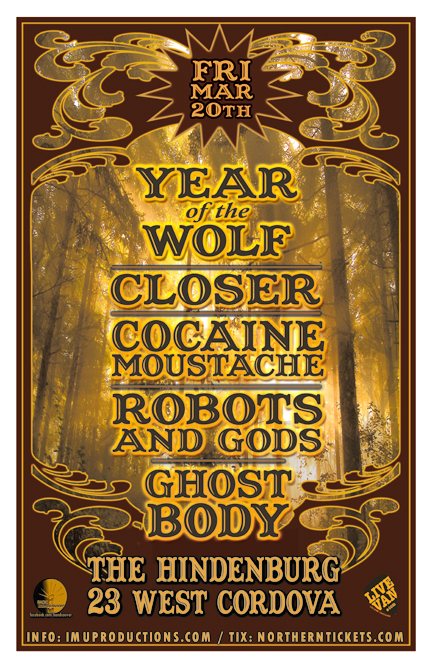 . Friday, March 20th IMU presents YEAR OF THE WOLF, CLOSER, COCAINE MOUSTACHE, ROBOTSANDGODS & GHOST BODY @ The Hindenburg, 23 West Cordova . Doors 8pm / Show 9pm . $10 Advance tickets available directly via the bands and online at http://www.imuproductions.com/tix / Cover $12 @ the door