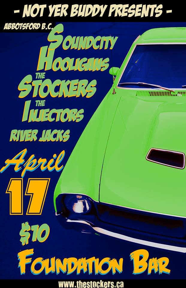 Kamloops' SOUNDCITY HOOLIGANS, Victoria's The Stockers, stAbby's The INJECTORS and Calgary's River Jacks meet one night only for a down n dirty demolition derby of the high octane punknroll variety. let's get good n greased up and show our guests a night to remember!