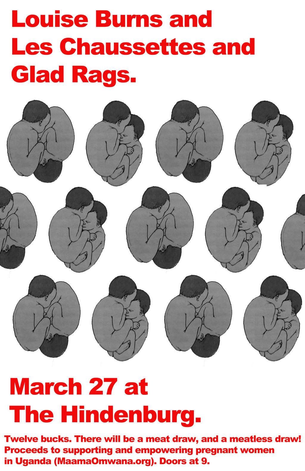 Maama Omwana Society presents Louise Burns, Les Chaussettes, and Glad Rags on March 27th at the Hindenburg. There will be a Meat Draw, and 'Meatless' Draw!