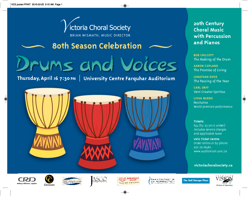 Over 100 voices in a double chorus, 2 pianos and a large percussion ensemble will be featured at the 80th Anniversary Concert of the Victoria Choral Society. Works include compositions by Bob Chilcott, Aaron Copland, Jonathan Dove, Carl Orff and a VCS commissioned work by local composer Liova Bueno.