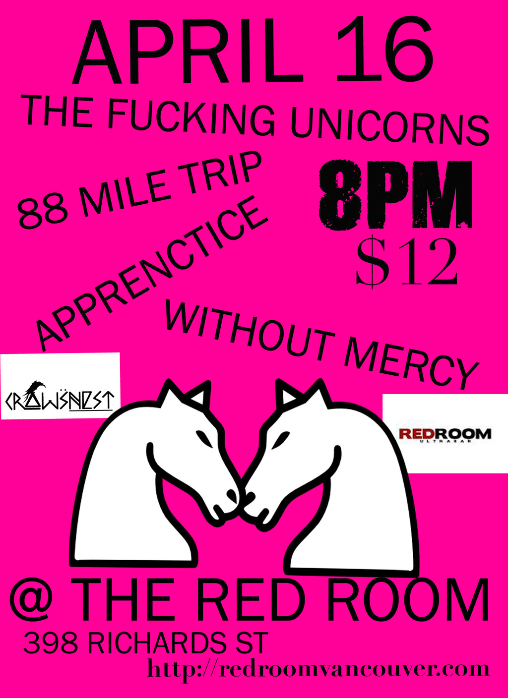 You know all of these bands. Of course you do. We all heard about the Fucking Unicorns antics last time they hit the stage. You know 88 Mile Trip has been one of the biggest rising bands in the city and backed by some serious muscle. Without Mercy has been a backbone of the VGA Metal/Rock scene for years. Apprentice, well, yeah, they're new. But in their brief history they've caught many the eye of us who go to/book/salivate over shows. So, yeah. This is all worth checking out.
