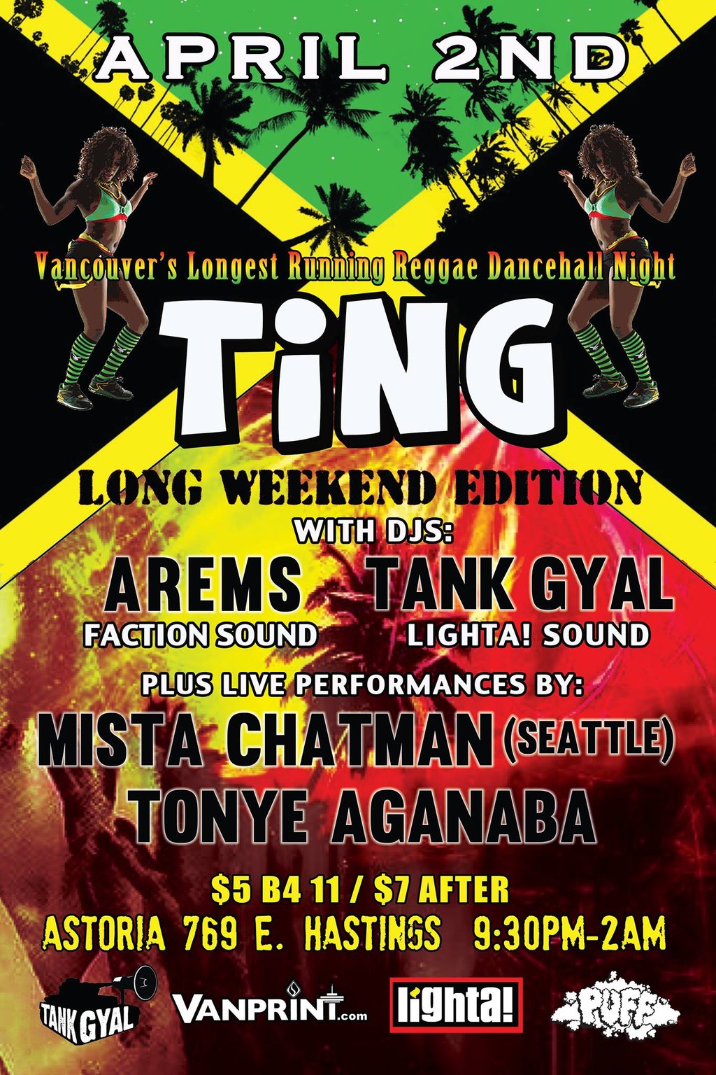 DJ AREMS of Faction Sound Crew plus Tank Gyal on the decks, plus live performances from Seattle's Mista Chatman and the Ting debut local powerhouse Tonye Aganaba.