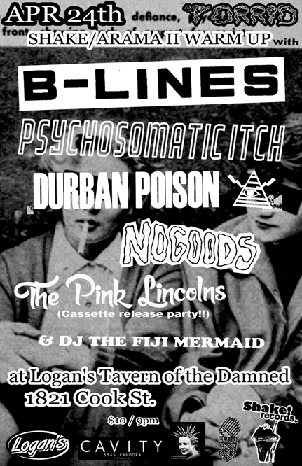Its a TORRID/SHAKEARAMA II WARM-UP with ...: B-Lines, PSYCHOSOMATIC ITCH, Durban Poison, NoGoods, THE PINK LINCOLNS  @ Logan's Pub Apr 24 2015 - Feb 5th @ Logan's Pub