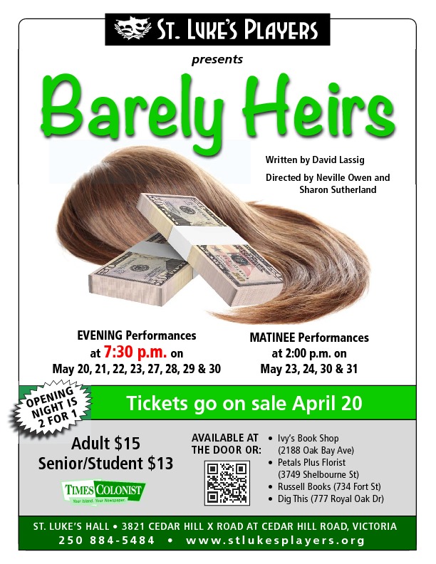 Physical tickets at: Ivy’s Book Shop 2188 Oak Bay Ave., Petals Plus Florist 3749 Shelbourne St., Dig This 777 Royal Oak Dr., Russell Books 734 Fort St.