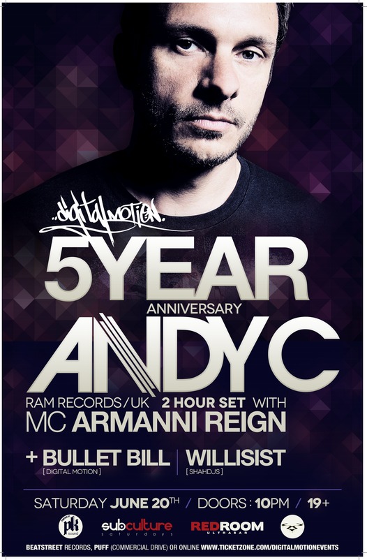 Digital Motion Events 5YR Anniversary feat: Andy C, ARMANNI REIGN , Bullet Bill , Willisist @ The Red Room Jun 20 2015 - Dec 24th @ The Red Room