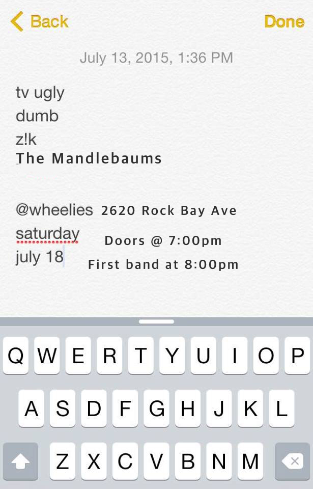 DUMB  (VANCOUVER), TV Ugly (VANCOUVER), THE MANDLEBAUMS  (VICTORIA), Z!K @ Wheelies Motorcyles Jul 18 2015 - Feb 8th @ Wheelies Motorcyles