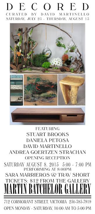 DECORED, is a group show curated by David Martinello that features west coast contemporary furniture of Stuart Brooks, boldly glazed modem ceramic vessels and tiles by Daniela Petosa, abstract impressionist paintings/sculpture as well as modern rustic furniture by David Martinello and artfully composed floral designs by Andrea Goertzen Strachan.