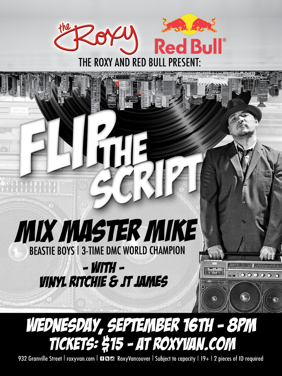 The Roxy and Red Bull present Flip The Script featuring legendary turntablist and Beastie Boys member Mix Master Mike. DJ’s, BBoys and MC’s take over this iconic Vancouver institution for an incredible night of beats with support sets from Vancity favourites Vinyl Ritchie and JT James.