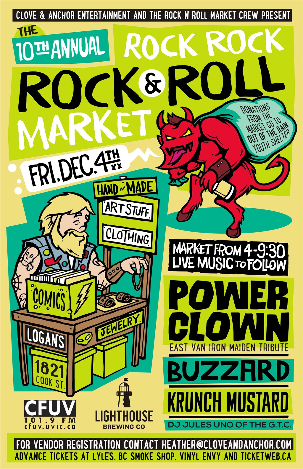 We are so pleased to announce the 10th Annual Rock, Rock, Rock, n’ Roll Market has returned Friday Dec.4th to Logan’s Pub, 1821 Cook Street. Our participating vendors consists of as always some of the fun and favorite local artisans from around Vancouver Island with a wide array of talent showcasing work from clothing, comics, prints, paintings, jewelry and leather ware and much more.