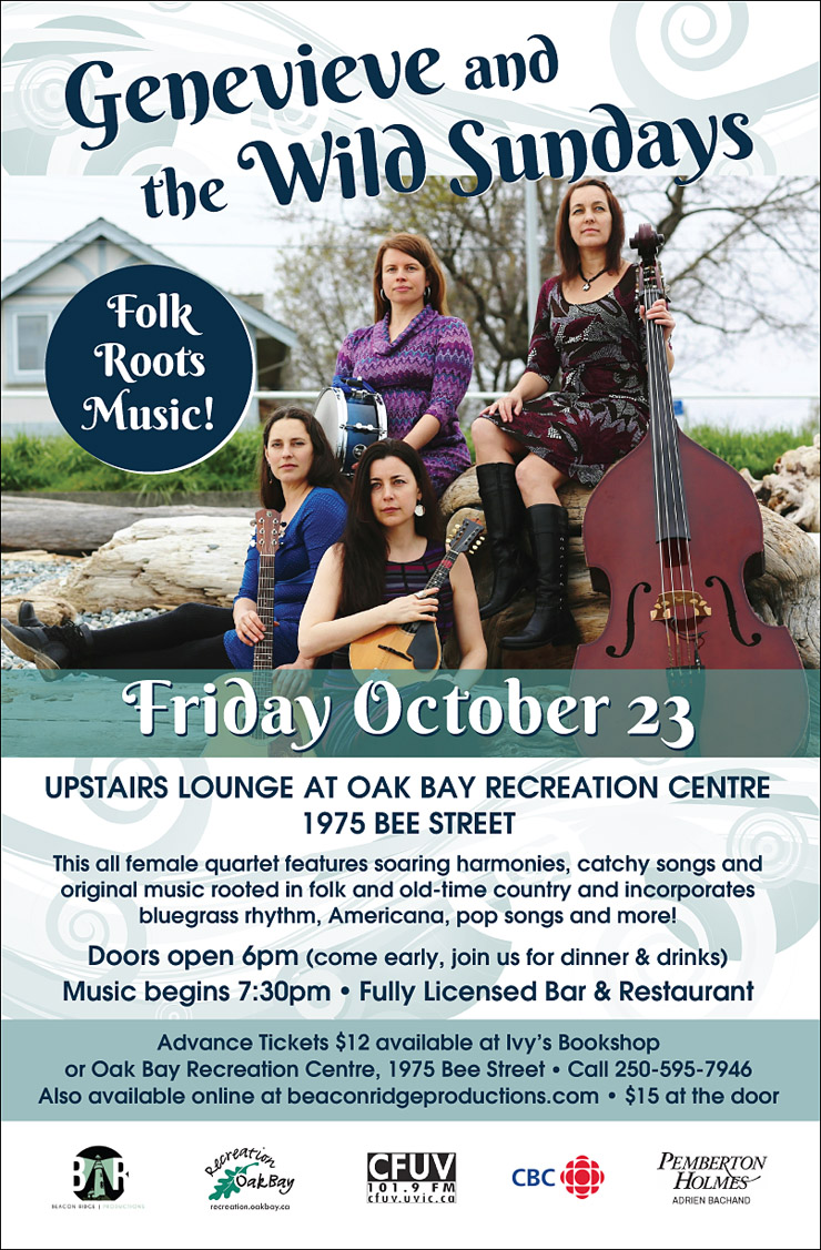 The music of the Wild Sundays is rooted in folk and old-time country, incorporating bluegrass rhythms, Americana, pop, and a whole lot more. Genevieve and Kelly Sherwin (upright bass/vocals) are long-time members of award-winning vocal ensemble Balkan Babes, singing traditional folk music of the Balkan region. Kelly also contributes a bluegrass sensibility (Flash in the Pan and Ain’t Dead Yet), while Laura Carleton (percussion/vocals) brings a background of choral music (Vancouver Island Chamber Choir) and West African percussion (Moondance Dynamic Arts). Chandra Crowe (mandolin/vocals) adds training in Greek, Turkish, Balkan and Middle Eastern music (Yiddish Columbia State Orchestra) into the mix. This eclectic experience brings a fusion flavour to a predominantly old-time sound, with a focus on three- and four-part harmonies.