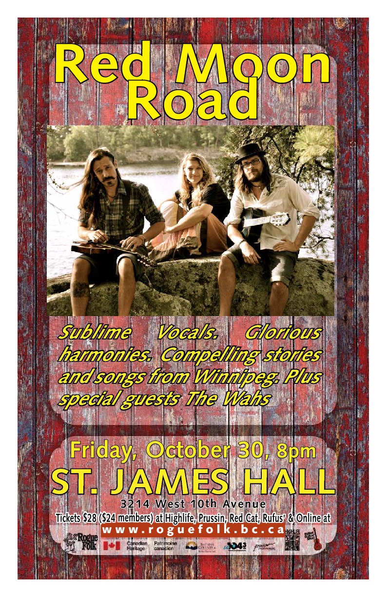 Winnipeg folk/roots trio, Red Moon Road, present their brand new album ‘Sorrows and Glories’. Local folk/pop trio The Wahs (Andy Hillhouse, Cam Wilson and Brent Gubbels) open the evening.