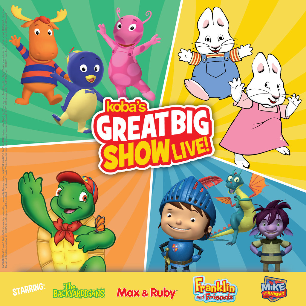 This exciting musical mix features the highpoints of Koba’s most popular productions. In this live show, the imaginative Backyardigans travel from the frozen north to the sunny seas and home again just in time for a snack! Hilarious results arise when everybody’s favourite bunny siblings Max & Ruby encounter some strange party guests! Have fun playing riddles and rhymes with Franklin the Turtle and his Woodland pals, then join the chivalrous Mike the Knight and his friends as they adventure throughout the magical kingdom of Glendragon.