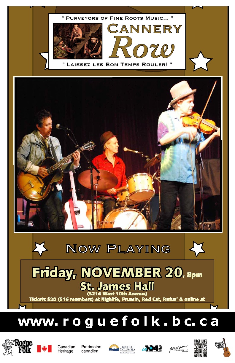 Cannery Row is a trio featuring the talents of Gary Comeau on piano, fiddle, accordion, mandolin, guitar, banjo & vocals; Tim Hearsey on guitar, slide guitar, banjo, vocals; and Chris Nordquist on drums, percussion, washboard, vocals. With diverse musical backgrounds and a common love of roots, folk, Latin, jazz & blues music, Cannery Row has woven an eclectic mix of original tunes.You will hear the influence of Mardi Gras from New Orleans, the blues from Memphis and the Mississippi delta, the Latin rhythms of Cuba, and a sprinkling of the early roots of Jazz.