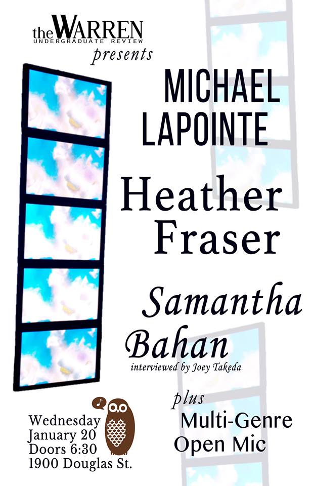 HEATHER FRASER graduated from UVic in 2014 with a BFA in Writing (minor in Religious Studies). Her poems have appeared in Poetry is Dead, Poetry Lives Here (a supplementary issue of Contemporary Verse 2), and This Side of West. Heather was awarded second place in Grain Magazine’s 2015 Short Grain Contest for her poem “Parasomnia.” She is currently working as an administrative clerk at UVic while completing a certificate in Professional Communication from UBC Continuing Studies.
