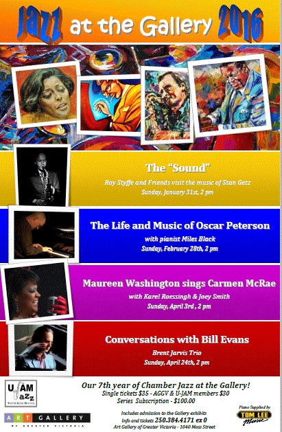Concerts are held at the Art Gallery of Greater Victoria on special Sunday afternoons, from January through April 2015. Individual tickets, including admission to the Gallery’s exhibits, are $35, with discounts available for AGGV and U-JAM members. Series subscriptions, including best seats in the house, are only $120 ($100 for U-JAM and AGGV members). Tickets and information are available through the Gallery by calling 250-384-4171 ext 1.