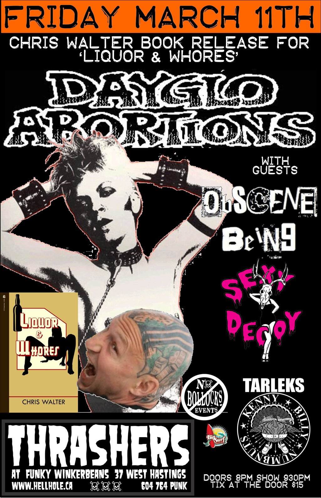 A book entitled Liquor & Whores can only be launched at a raunchy Downtown Eastside bar, and what better band to host that launch than the infamous Dayglo Abortions? Join us for a wild night of punk rock, filthy literature, and waaay too much booze. That book you wake up with the next day will compliment your ringing ears and blurry vision perfectly.